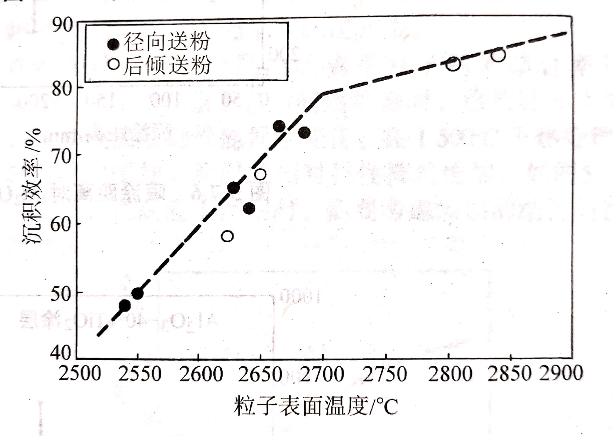 圖(3)氧化鋯涂層沉積效率隨粒子表面溫度的變化